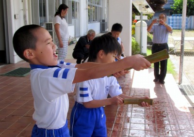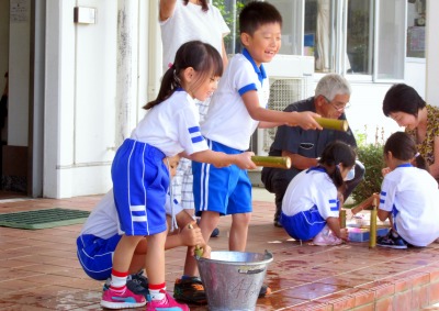 祖父母・保護者ふれあい参観で作った水鉄砲。生活科の時間に、水鉄砲を使ってみんなで遊びました!