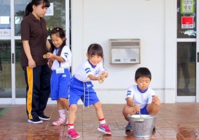 水鉄砲作りは大成功! 水が勢いよくとんでいきます! 子どもたちはうれしくて、うれしくて何度も水をとばしていました。