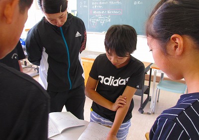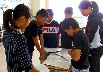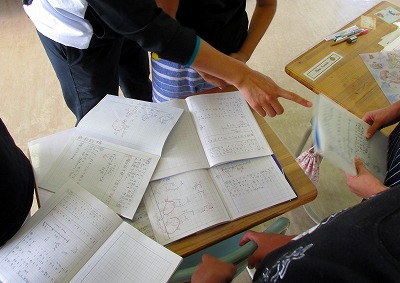 みんなでノートを持ち寄り、お互いの考え方を比べながら、自分の考えを発表する時間。どうしてそのような式を立てたのか、自分の考えをしっかりと説明できるように、説明する場を大切にしています。