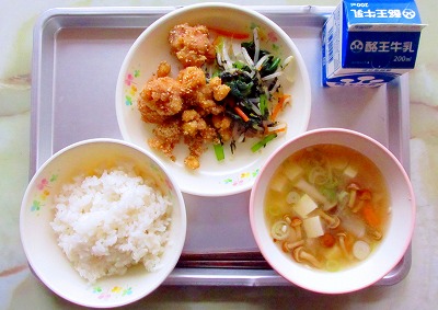 今日の給食は、麦ごはん、牛乳、鶏肉と豆のごまみそ和え、小松菜の海苔和え、きのこ汁です。