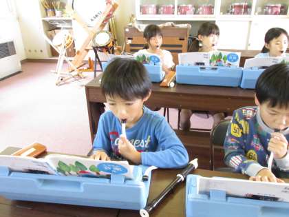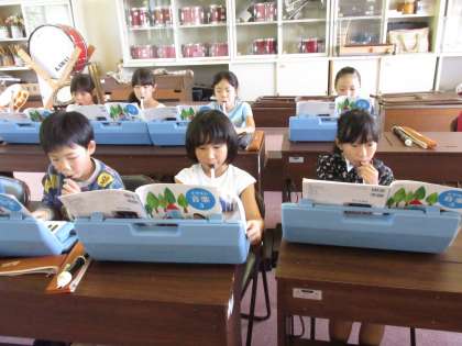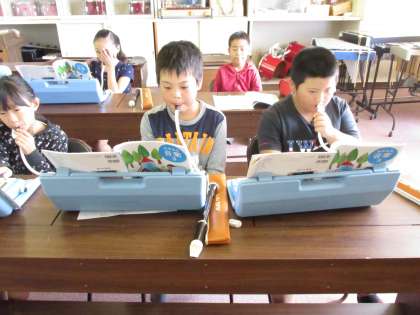 3・4年生は、音楽室で、音楽の学習。ピアノの伴奏に合わせて、鍵盤ハーモニカで演奏しました。みんなの音が合うと、とてもすてきな音色になりました!