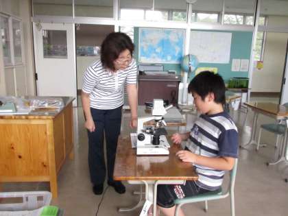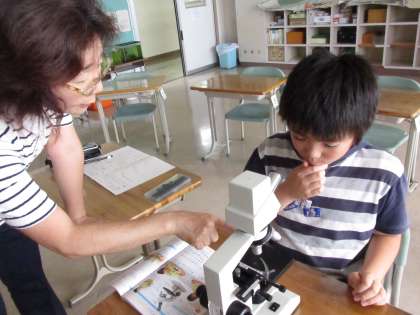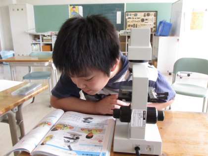 5年の理科は、ヘチマの花粉を調べる学習! そこで、ヘチマの花粉を、顕微鏡で調べました。顕微鏡の使い方を確認しながら、花粉を調べることができました。