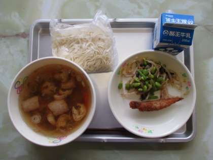 今日のこんだては、五目うどん、牛乳、ししゃも天ぷら、枝豆入りおひたしでした。