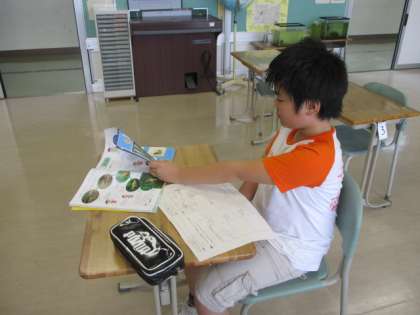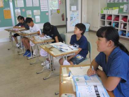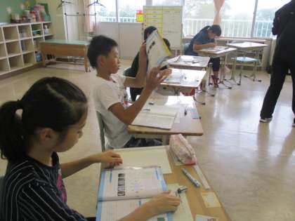 5・6年生の理科の授業のようすです。5年生は「花から実へ」をテーマに学習していました。雄花と雌花の違いについて、まとめていました。6年生は「太陽と月の形」をテーマに学習していました。子どもたちは、それぞれの形や動きについて、まとめの問題に取り組んでいました。