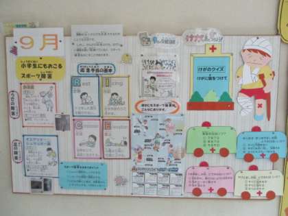 保健室前の掲示板のようすです。9月は「けが」がテーマです。そして、秋蛍に向けて行灯ができました。