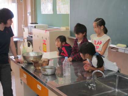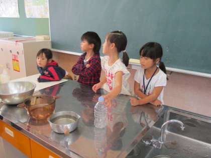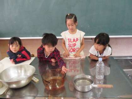 1年生の算数の授業のようすです。水のかさをテーマに学習していました。子どもたちは、3つの大きさが異なる入れ物に入った水の量を比べる方法について考えていました。