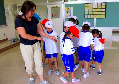 どうしても忘れられない今日の学習活動が、1・2年生のオクラホマミキサーです。大きい円で踊り始めたのに、動き方に真剣になって取り組むうちに、子どもたちの円はどんどん小さくなっていきます。よく見ていると、子どもたちは先生に教えてもらった動きどおりに踊ろうと真剣なのです。