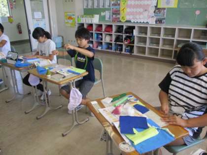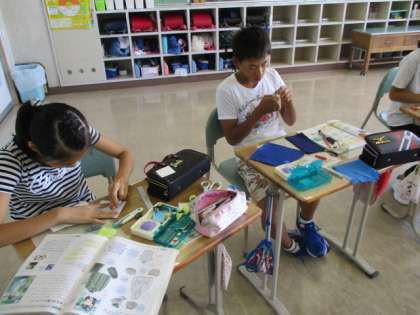 5・6年生の家庭科の授業のようすです。5年生は、初めて針と糸でなみ縫い、玉どめに挑戦していました。6年生はフェルトを使って、小物作りに取り組んでいました。