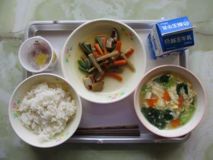 今日のこんだては、麦ごはん、牛乳、納豆、五目きんぴら、かき卵みそ汁でした。