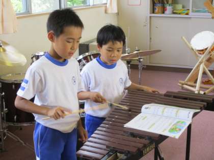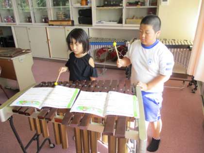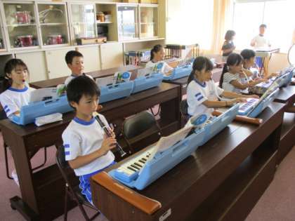 3・4年生の音楽の授業のようすです。合奏「ゆかいな木きん」の練習をしていました。子どもたちは、それぞれに木琴、リコーダー、鍵盤ハーモニカを担当し、楽譜を見ながら一生懸命に演奏していました。