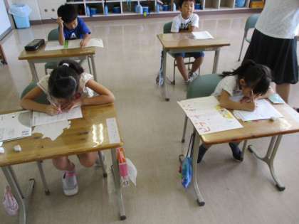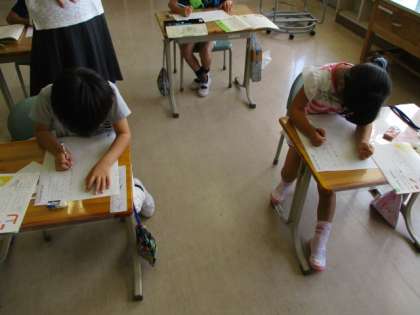 1年生の書写の授業のようすです。かたかなの練習をしていました。子どもたちは、練習用紙を使って、一文字ずつ丁寧に書いていました。