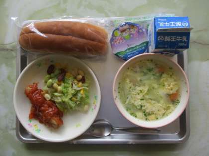 今日のこんだては、ドッグパン、牛乳、フランクフルトのケチャップソースがけ、豆サラダ、卵のスープ、お月見ゼリーでした。