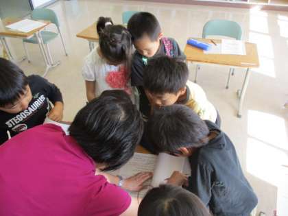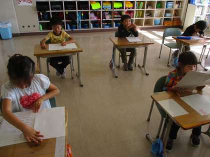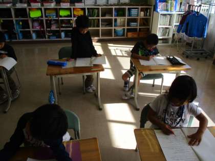1・2年生の国語の授業のようすです。海老根フェスティバルに向けて、劇の台本の読み合わせをしていました。子どもたちは、自分の台詞を確かめた後、みんなで読み合わせをしていました。