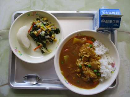 今日のこんだては、ポークカレーライス、牛乳、海藻と野菜のサラダ、梨でした。