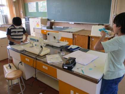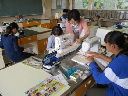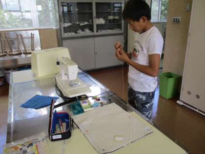5・6年生の家庭科の授業のようすです。生活に役立つ物を作ろうをテーマに学習していました。子どもたちは、縫う場所や順序に気をつけて、バックやナップザックを作っていました。