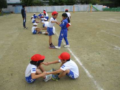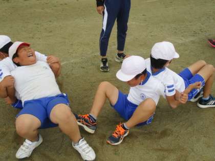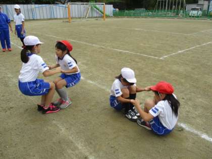 3・4年生の体育の授業のようすです。子どもたちは、体づくりの運動に取り組んだ後、マラソン大会に向けて、持久力を高めるトレーニングをしていました。