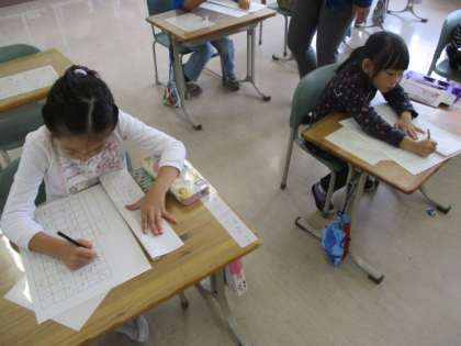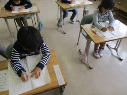 1年生の書写の授業のようすです。子どもたちは、お手本をみながら、一文字一文字丁寧に書いていました。