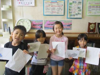 1年生の国語の授業のようすです。しらせたいな、見せたいなをテーマに学習していました。子どもたちは、校長室で、一人ずつ描いた絵を見せながら、作文を発表してくれました。みんな上手に発表ができました。