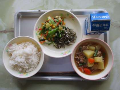 今日のこんだては、麦ごはん、牛乳、肉じゃが、青のりちりめんじゃこ、野菜のごま風味和えでした。