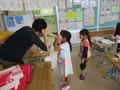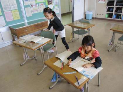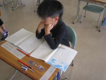 1年生の国語の授業のようすです。「くじらぐも」の学習をしていました。子どもたちは、お話の最初の場面の読み取りをしていました。物語の始まりは「いつ」「どこで」のことなのか、文を読んで考えていました。答えを見つけたら、先生にそっと教えに行きます。