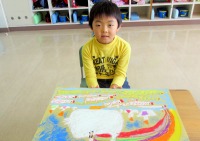 ここで、子どもたちの作品を少しだけ紹介します! ただし、完成した作品をぜひご覧いただきたいので、画質をうーんと落としてちょっとだけ紹介させていただくことにしますので、お許しください。子どもたちの力作は、自由参観デーの際に!