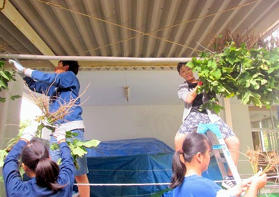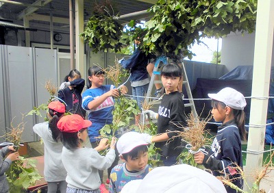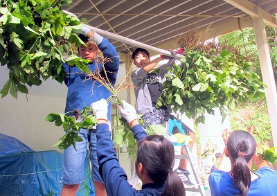 6年生が、収穫したトロロアオイを束ね方を下級生に教えた後は、トロロアオイの束を体育館前通路に運びます。ここからは、6年男子が大活躍!! 3・4年生が持ってきた束を6年女子が受け取り、広げて6年男子に渡すと、6年男子2名が、竿から落ちないようにていねいに並べて干しました。このときの6年生の姿を、とても頼もしく感じました! 本当にかっこよかったです!