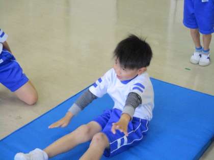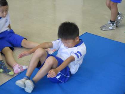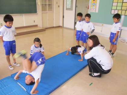 1・2年生の体育の授業のようすです。マットを使って学習していました。子どもたちは、手の着き方や回る時の姿勢に気をつけながら、前転の練習をしていました。
