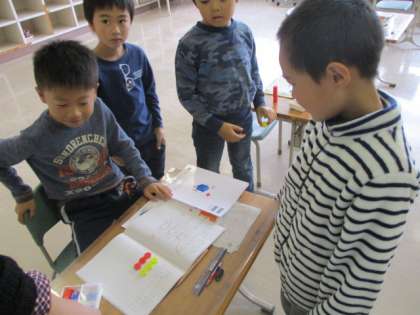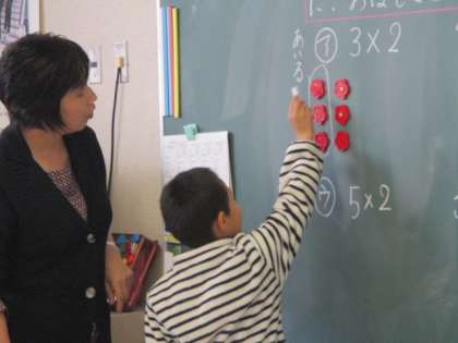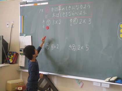 2年生の算数の授業のようすです。かけ算の学習をしていました。子どもたちは、かけ算の式に合うようにおはじきを並べていました。そして、自分の考えをみんなの前で発表していました。