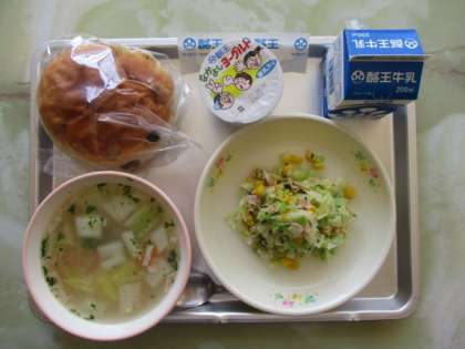 今日のこんだては、レーズンパン、牛乳、野菜スープ、ツナ入りサラダ、ヨーグルトでした。