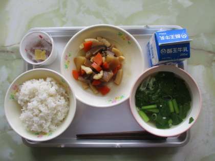 今日のこんだては、麦ごはん、牛乳、納豆、大根といかの煮物、小松菜とじゃがいものみそ汁でした。