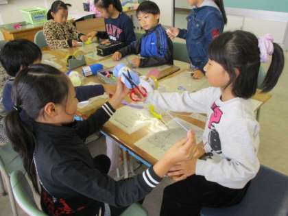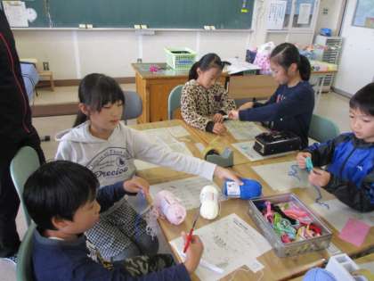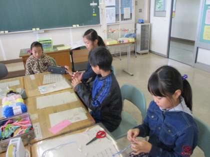 家庭科クラブでは、ミサンガ作りに取り組んでいました。今日は、3年生がクラブ活動体験をしていました。3年生に優しく作り方を教えていました。