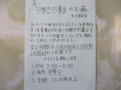 生活委員会が、赤い羽根共同募金活動を行います。明日20日と来週23日・24日の朝、7時50分から8時までの間、昇降口で募金してください。皆さんのご協力をお願いします。