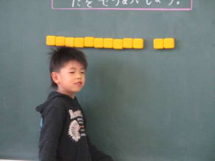 1年生の算数の授業のようすです。繰り下がりのあるひき算の学習をしていました。子どもたちは、12−9の計算の仕方を、ブロックや百玉そろばんを使って、説明していました。