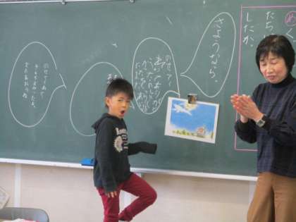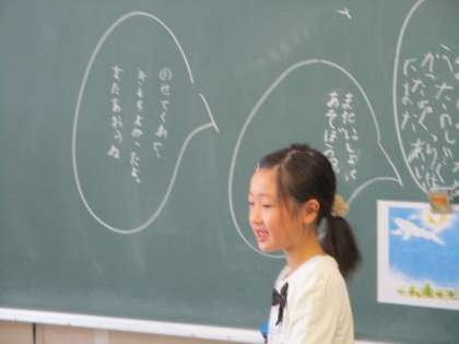 1年生の国語の授業のようすです。「くじらぐも」の学習をしていました。子どもたちは、くじらに向かって話す言葉を考え、黒板に書いて発表していました。