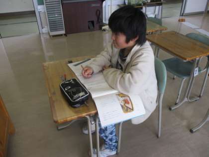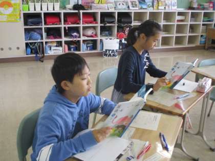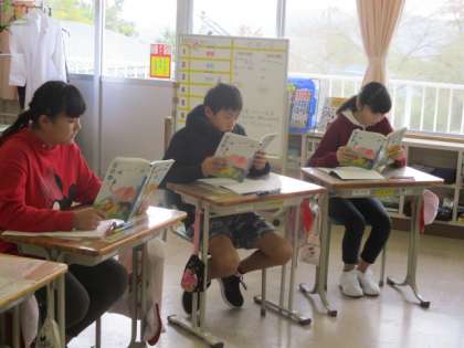 5・6年生の国語の授業のようすです。5年生は「大造じいさんとガン」の学習をしていました。物語の設定について確かめていました。6年生は「やまなし」の学習をしていました。子どもたちは、一文ずつ順番に音読していました。