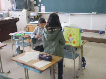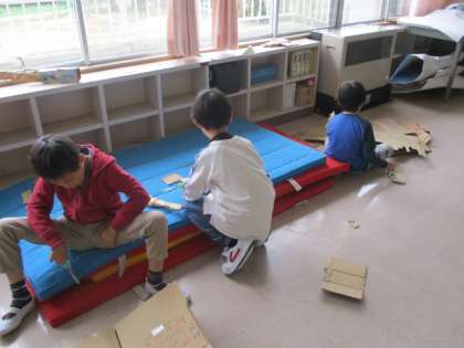 3・4年生の総合的な学習のようすです。海老根フェスティバルに向けて、小道具を準備していました。