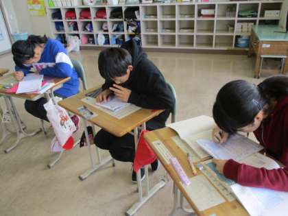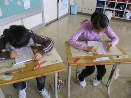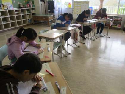 6年生の算数の授業のようすです。比例のグラフの読み方を学習していました。子どもたちは、ドリルの問題を真剣に解いていました。集中力がすばらしい。