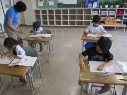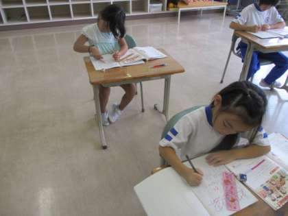 2年生の算数の授業のようすです。たし算とひき算の筆算をテーマに学習していました。子どもたちは、教科書の練習問題に取り組んでいました。