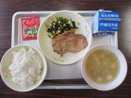 今日のこんだては、麦ごはん、牛乳、やさいふりかけ、豚肉のしょうが焼き、ひじき入りおひたし、けんちん汁でした。