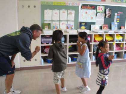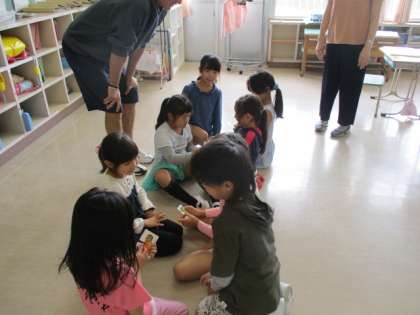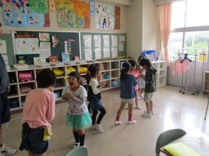 1・2年生の英語表現の授業のようすです。子どもたちは、絵合わせカードを使って、野菜や果物の名前を言いながら、対のカードを持っている相手を探していました。