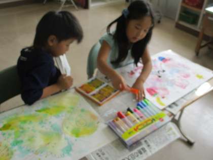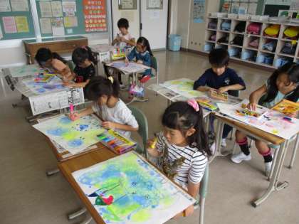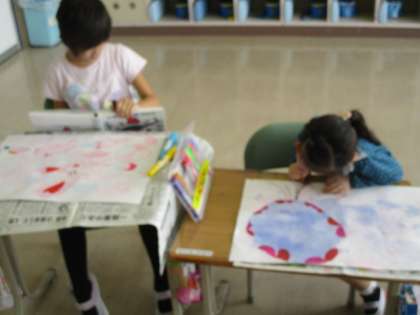 1・2年生の図工の授業のようすです。「キラキラ シャボンで」の学習をしていました。子どもたちは、画用紙に付けた泡の模様から想像を広げて、絵をかいていました。