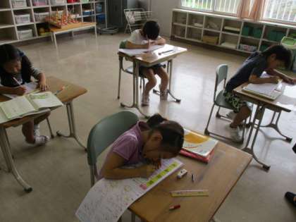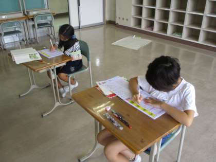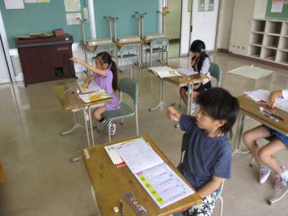 2年生の国語の授業のようすです。「どうぶつ園のじゅうい」の学習をしていました。漢字ドリルを使って、「朝」や「顔」など、新出漢字の練習をしていました。
