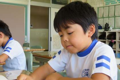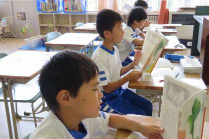 国語科「ちいちゃんのかげおくり」の単元を学習し始めた3年生。場面の移り変わりをとらえるために、まずしっかりと音読を行いました。登場人物や場面のようすを気にしながら、先生と一緒に、はっきりとした声で音読することができました。