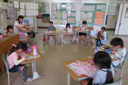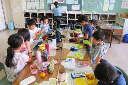 家の人が工夫して作ってくれたお弁当を、楽しい雰囲気の中でいただきました。自分の好きなものが入っているお弁当を、友達や先生方に笑顔で見せていました。