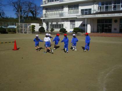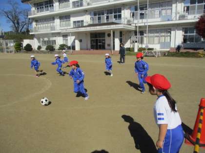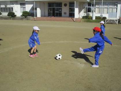 1・2年生の体育の授業のようすです。ボールを使って学習していました。子どもたちは、相手のゴールにボールを入れようと、一生懸命にボールを追いかけていました。