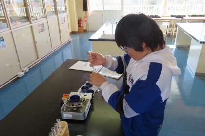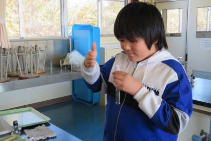 6年生の理科の授業のようすです。5種類の水溶液の違いを調べる実験を行いました。水溶液のにおいをかいだり、水溶液を熱して残ったものを観察したりしました。
