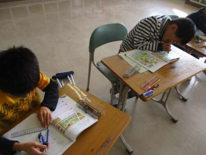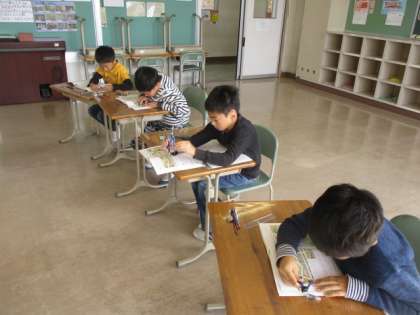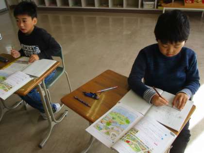 3年生の算数の授業のようすです。コンパスを使って学習していました。子どもたちは、直線と折れ線の長さをコンパスを使って比べていました。