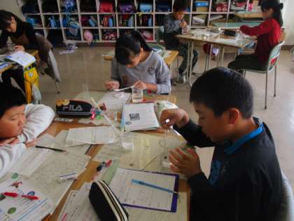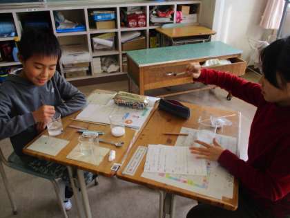 5年生の理科の授業のようすです。物のとけ方をテーマに学習していました。子どもたちは、食塩とミョウバンを使って、水の量を変えたときの溶ける量の違いについて実験していました。