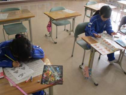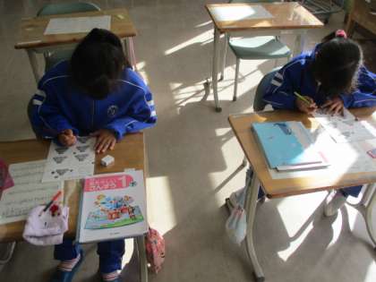 1年生の算数の授業のようすです。「けいさんピラミッド」の問題に取り組んでいました。子どもたちは、ヒントをもとに、ピラミッド型に並んだマス入る数を考えていました。
