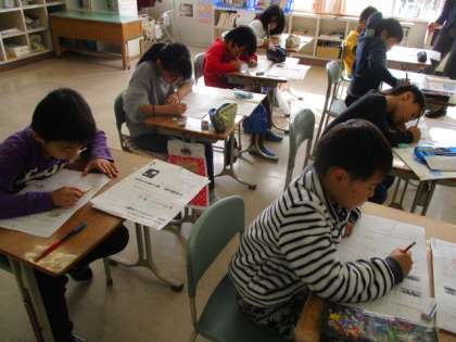 3・4年生の書写の授業のようすです。硬筆の学習をしていました。子どもたちは、これまでの毛筆の学習を活かして、一文字ずつ丁寧に書いていました。